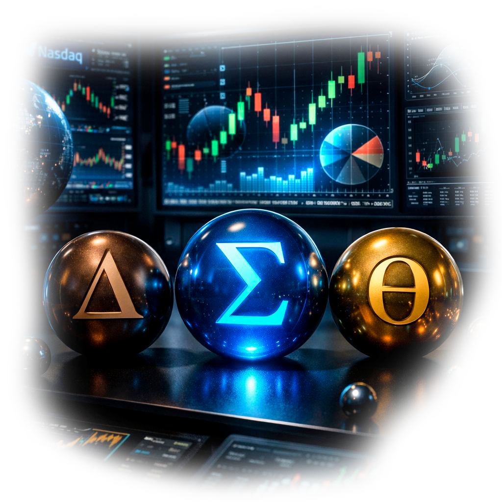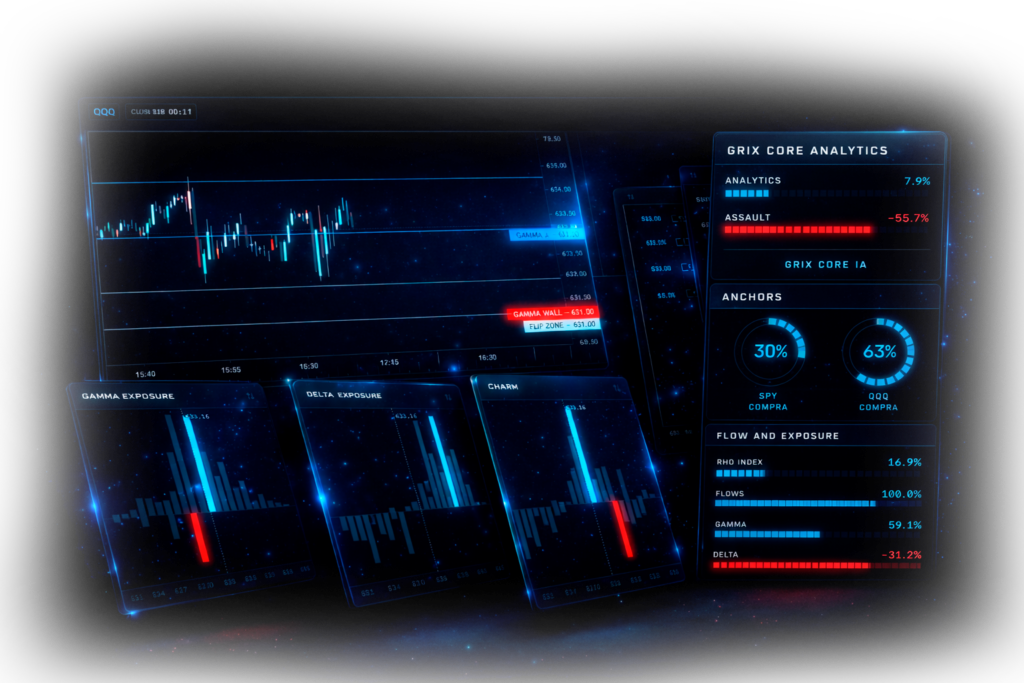 A GrixCore analisa o fluxo em tempo real de Calls e Puts de QQQ, utilizando modelos quantitativos derivados de Black-Scholes para mapear a atividade de dealers e market makers. Esses dados são traduzidos em uma leitura de mercado objetiva e execução algorítmica aplicada aos futuros da Nasdaq.